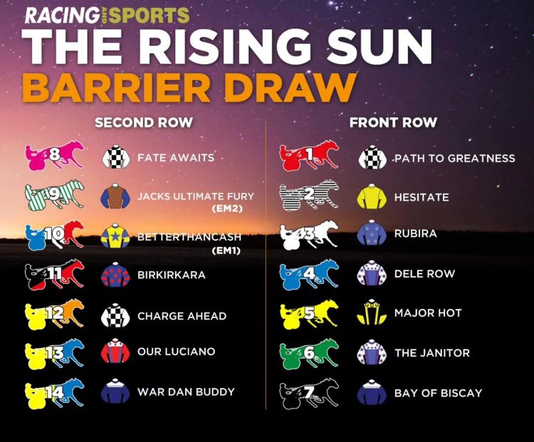 The barrier draw for Saturday night’s big Group 1 Rising Sun was announced by The Creek a short time ago (see right).