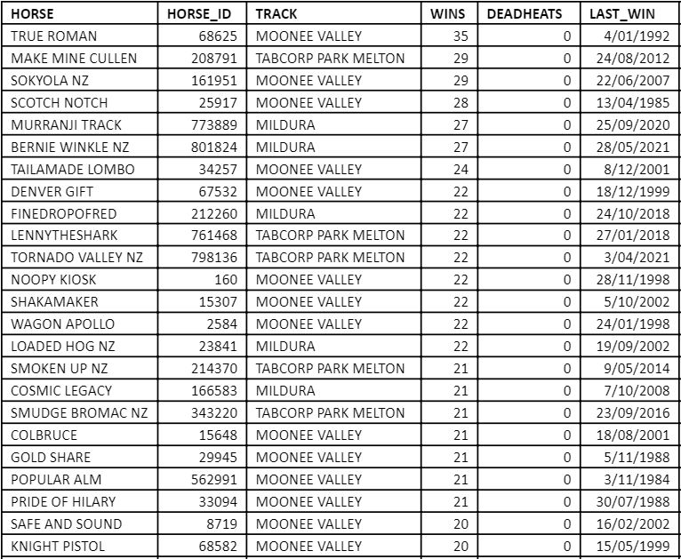 True Roman holds the modern era record of most wins at a single Victorian track, scoring an amazing 35 times at Moonee Valley. The last of those came on January 4, 1992, the second last run of a career that captured 73 victories in total.