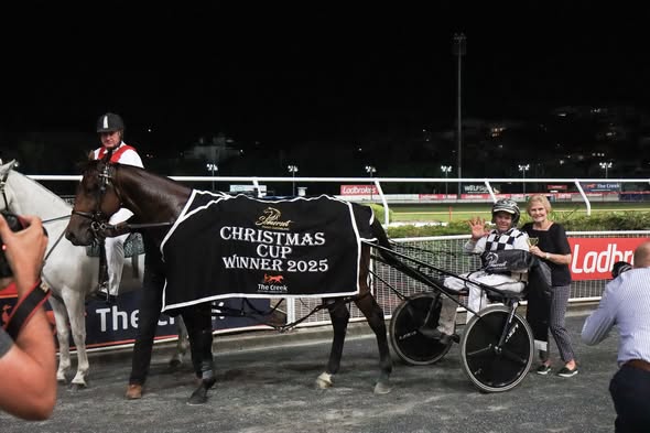 Australia’s favourite pacer Leap To Fame (Bettors Delight) returned to his winning ways when as expected he scored an easy all the way harness racing win in the 2025 Somerset Farms Christmas Cup at Albion Park on Saturday evening. Only a week ago Leap To Fame recorded one of his greatest performances when he was cut down by Don Hugo in the last stride in the Blacks A Fake after covering a huge amount of extra ground.