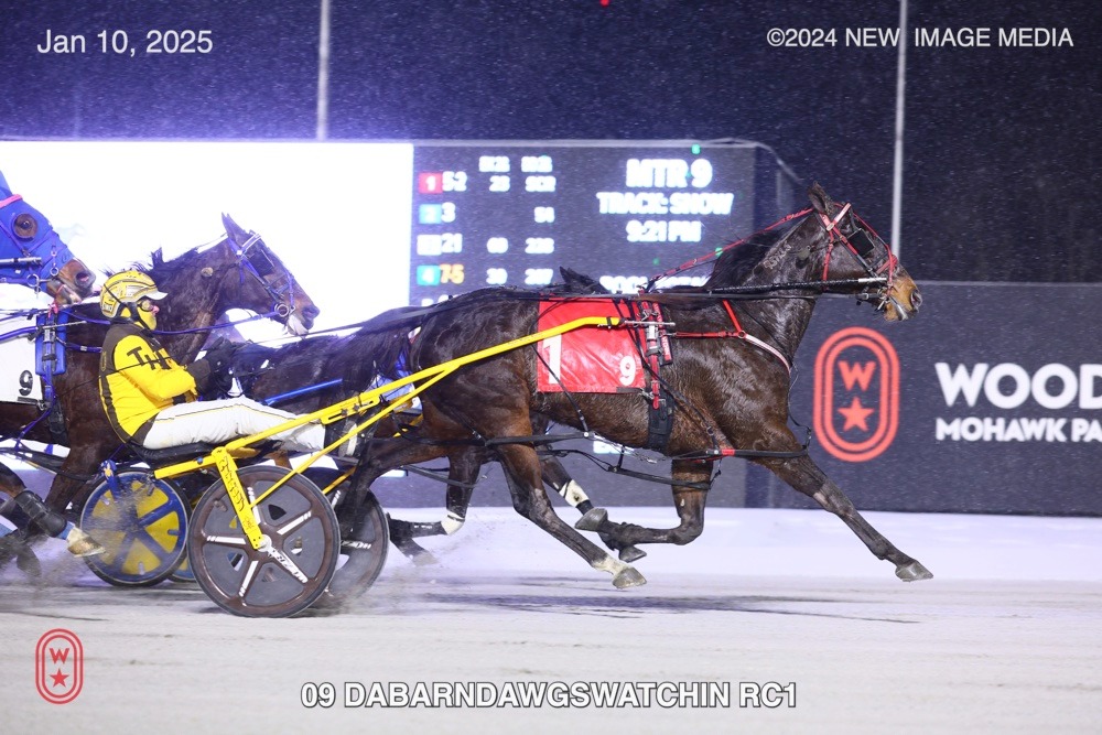 Dabarndawgswatchin (Hes Watching) defeated triple O’Brien Award winner So Much More to win her first start of the year in an upper-level conditioned harness racing contest on Friday (Jan. 10) at Woodbine Mohawk Park.