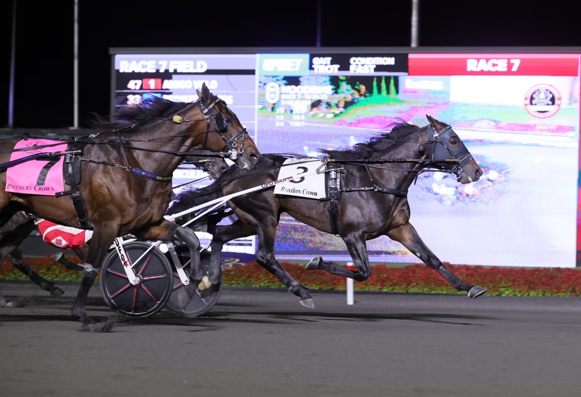 MILTON, October 25, 2025— French Wine (Bar Hopping) took the $822,000 (CAD) ($600,000USD) Breeders Crown Open Trot in a new stakes record of 1:50.1 with Jason Bartlett at the lines, who notched his second Crown harness racing victory of the weekend on Saturday night at Woodbine Mohawk Park.