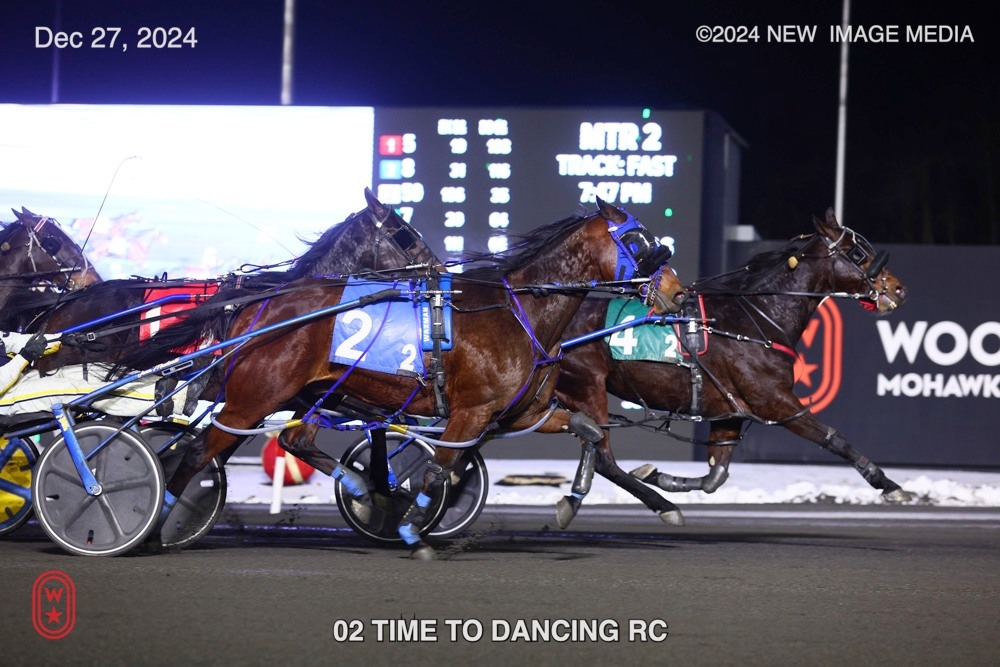 After a lifetime on the Eastern Ontario/Quebec harness racing circuit, Time To Dancing (Time To Roll) flew late to win his second-ever start at Woodbine Mohawk Park in the Pop-up Series consolation on Friday (Dec. 27).