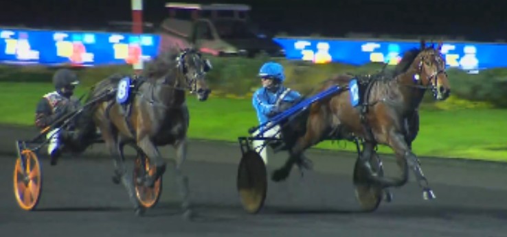 Kobayaski  (5m Face Time  Bourbon-Come On Jet) was third for trainer/driver Mathieu Mottier off at 24/1for owner Ecurie Hunter Valley. King Opera (5m Ready Cash-Unlimited  Jet) took  fourth at 10/1odds  for trainer/driver William Bigeon  and Joel Seche, ahead of fifth finishing 20/1 Ksar (5m Follow You-Tes Amours)  with  Matthieu Abrivard up. Kana de Beylev (5f Express Jet) and Kuiper (5m Face Time Bourbon) completed the top seven.