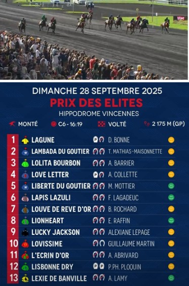The 4.6/1 Lionheart won for the ninth time in 16 career starts for 342,530€ earned. The 1.9/1 odds favorite Liberte du Goutier (4f Prodigious-Candie d’Atout) ended second with Mathieu Mottier in the irons for Ecurie Saint Martin and trainer Thierry Duvaldestin. Love Letter (4f Royal Dream-Endiablee) was third at 22/1 for Alexis Collette aboard for Julien Dubois the trainer/owner. Lexie de Banville (4f Real de Lou) at 9/1 and 36/1 odds Lolita Bourbon (4f Orlando Vici) completed the top five.