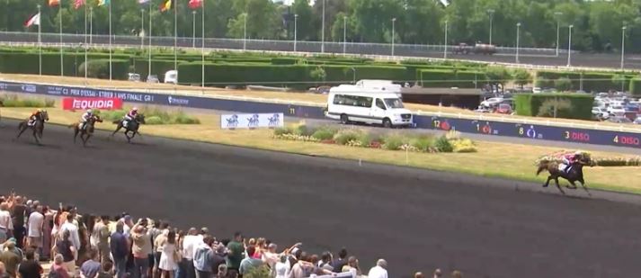 He was timed in 1.13.4kr in defeating 103/1 Melody de Vivoin (3f Seigneur Aimef) and her jockey J-Y Ricard and trainer/owner Emmanuel Varin, Home third was 17/1 odds Mademoiselie Jane (3f Ready Cash-Angelica) ridden by Adrien Lamy for Ecurie des Charmes and trainer Clement Thomain. Matignon (3m Bird Parker) was fourth at 4.2/1 odds with jockey Alexandre Abrivard in the irons.