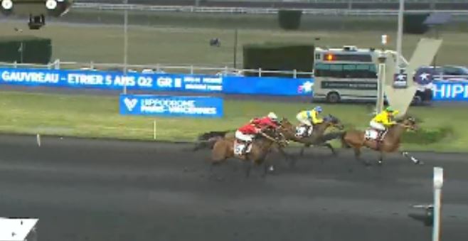 In the Gr. II Prix Jean Gauvreau-Etrier 5 Ans Q2 (monte, 120,000€ purse, 2175 meters, eight five year old starters) the 5.7/1 odds Kano (5m Uhlan de Val-A Mery de Chahains) was the 1.12.4kr timed winner ridden by Guillaume Martin for trainer/owner Cedrik Megissier.
