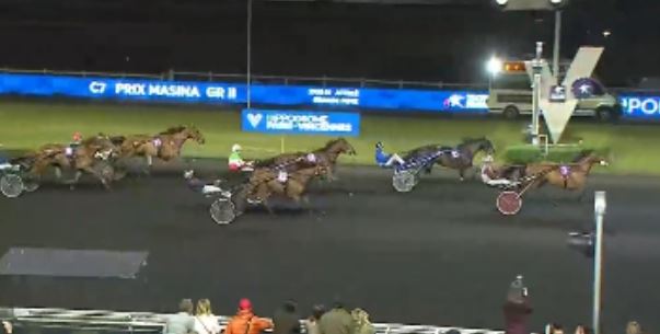 The 6/10 odds favorite Maitre Jacques (3m Rollin d’Heripre-Adelie-Ganymede) took control to win the Gr. II Prix Paul Karle (purse 120,000€, 2700 meters, nine three year old male starters) for harnesss racing driver Alexandre Abrivard for trainer L.C. Abrivard and breeder/owner Jacques Cottel.