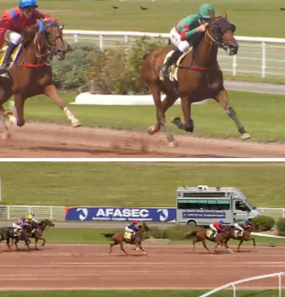 The Prix de Bezons (purse 33,000€, 2250 meters voltstart, nine two year old filly starters) began the card today and 4/10 odds favorite Normandie Niemen (2f Italiano Vero-Best Lady-Saxo de Vandel) was a highlight as she earned her first win for trainer/owner Philippe Allaire.