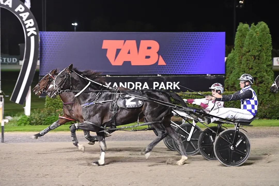 In last night’s $100,000 Group One Breckon Farms Young Guns Cardigan Bay Stakes at Alexandra Park, Fugitive (Downbytheseaside) had to hang tough for most of the race and then withstand a late charge to win the juvenile harness racing feature – by an ever diminishing margin.