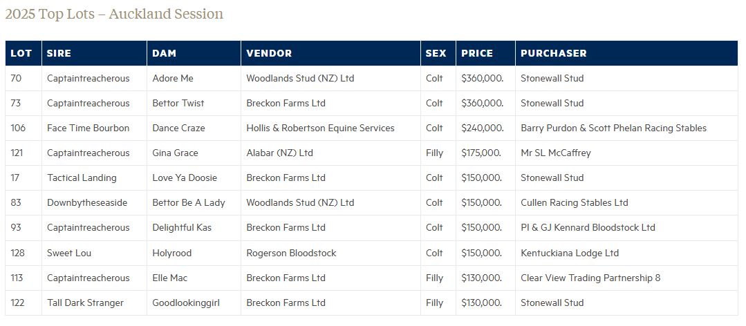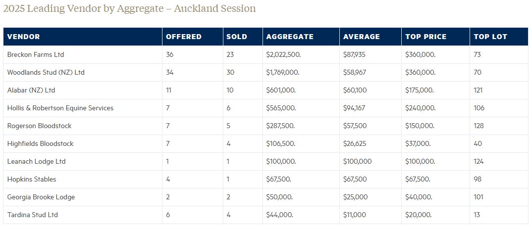 Leading vendors for Auckland were Breckon Farms, selling 23 lots for a total aggregate of $2,022,500. While the leading vendor by average award went to Hollis & Robertson Equine Services who sold six lots at an average of $94,167.