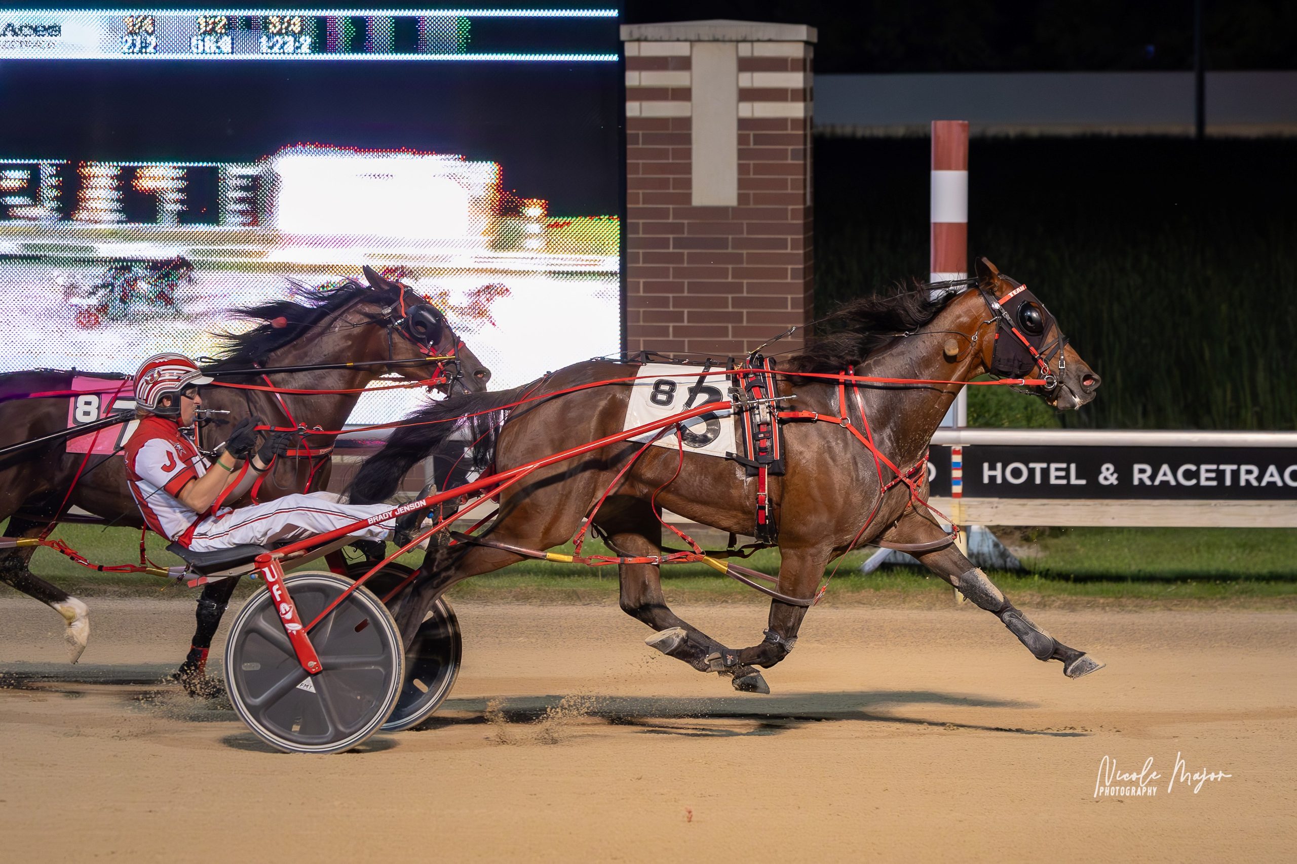 Set Free (Rick Magee, $3.20) completed a gate-to-wire score by a nose in the $15,000 freshman colts ‘A’ pace in 1:56.3 over Wild About Me (Jenson) and Whatevrittakestwo (Luke Plano) for his fifth win in eight career starts for the son of Three Of Clubs, owned by Jay De Long, Ken Stauffer and Stephanie Anfinson and trained by Justin Anfinson.