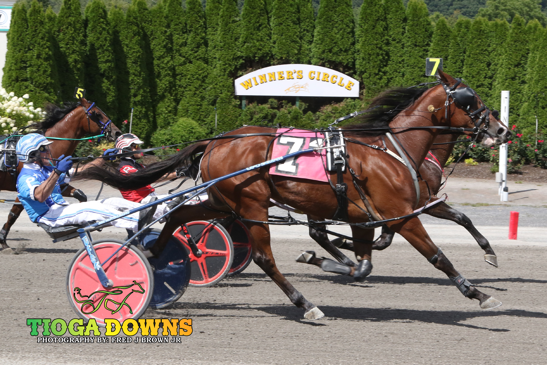 Bartertown (Brett Crawford) captures the $10,000 featured harness racing pace at Tioga Downs on Monday (September 1).