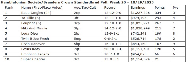 Twin B Joe Fresh, who was scratched from her Breeders Crown final, was No. 6 and followed by Breeders Crown Open Pace winner Ervin Hanover. Lexus Kody, Emoticon Legacy and Super Chapter, who were third, seventh and second in their respective Breeders Crown finals, completed the Top 10.