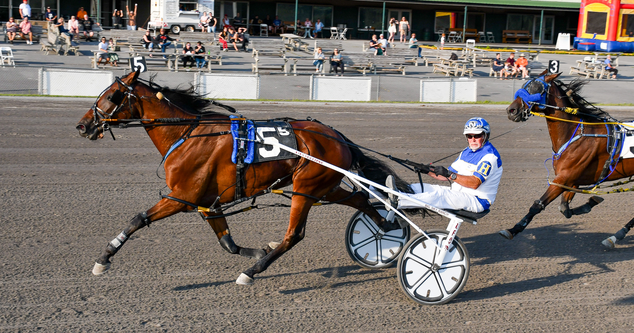 Bluesville (Ron Harp) captures the featured $7,500 harness racing pace at Vernon Downs on Saturday (August 2).
