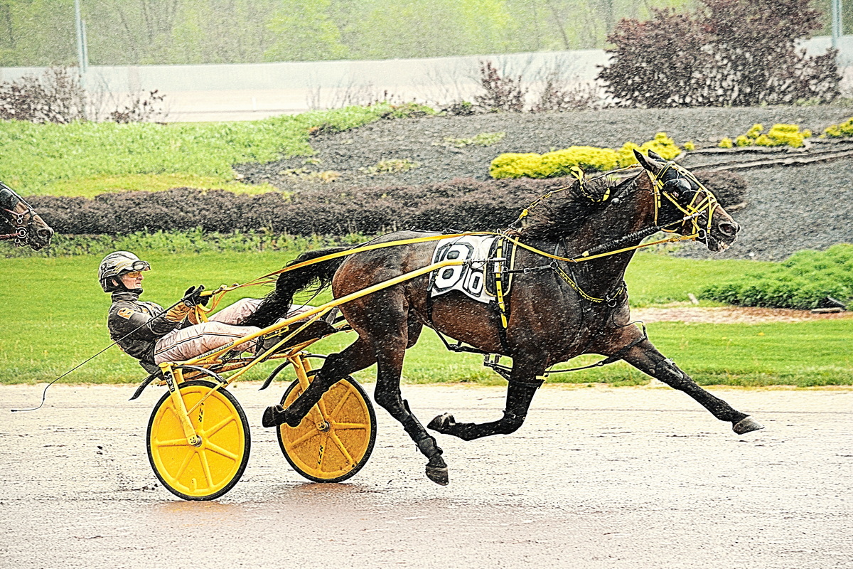 Buter also won the day’s co-feature, a $15,000 claiming handicap trot for horses just below the feature prices. Again he rallied his horse to overcome the uncovered route; here it was 10-1 shot Rose Run Elegant, a Rose Run Hooligan gelding who won in 1:54.4 before the rains came (“fast” track) for trainer Susan Marshall, co-owner with John Marshall. Buter, who had three victories in all on Tuesday, completed the four-day week at Pocono with fourteen trips to the winners circle.