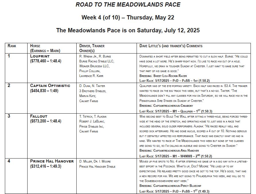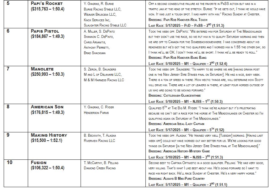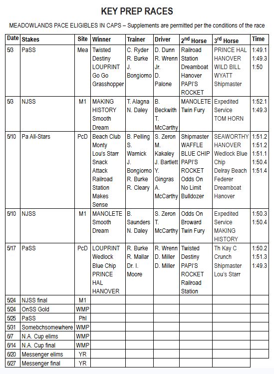 EAST RUTHERFORD, NJ — Off a lifetime-best 1:49.3 score last week at Pocono Downs, the Dr. Ian Moore-trained Prince Hal Hanover made a big move in Dave Little’s Road to the Meadowlands Pace poll, as the son of Captaintreacherous-Percy Bluechip jumped up from No. 9 to No. 4 in the weekly Top 10.