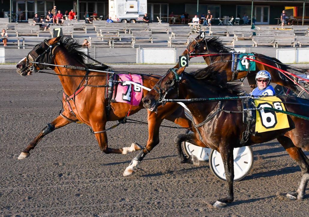 Dewey Arnold (Ron Harp) hangs on to capture the $8,500 featured Open harness racing Trot at Vernon Downs on Friday (August 15).
