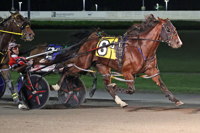 Odds On No Limit (Matt Kakaley) and Papi’s Rocket (Yannick Gingras) blasted out of the gate from posts six and eight, respectively, with the latter hitting the front and the former landing in the pocket in the second $25,000 MGM Grand Messenger elimination. Behind that pair, Dunn took World Of Wishes to the pylons and settled in third, ahead of 2-5 favorite Thirsty Thursday.
