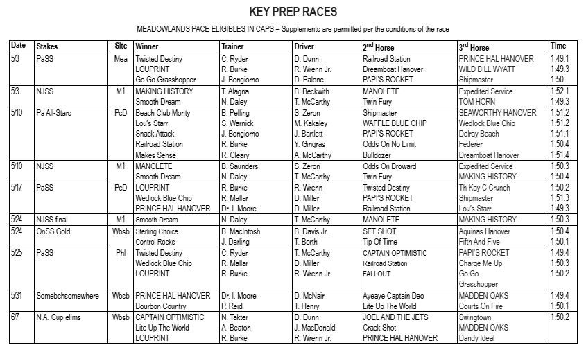 EAST RUTHERFORD, NJ — None of the horses in the first three positions of Dave Little’s Road to the Meadowlands Pace poll were in action last week, but Fallout was winning to move up a notch and become the new No. 4. The 10th and final weekly Top 10 comes out Thursday, July 3. Eliminations for the Pace are on Saturday, July 5.