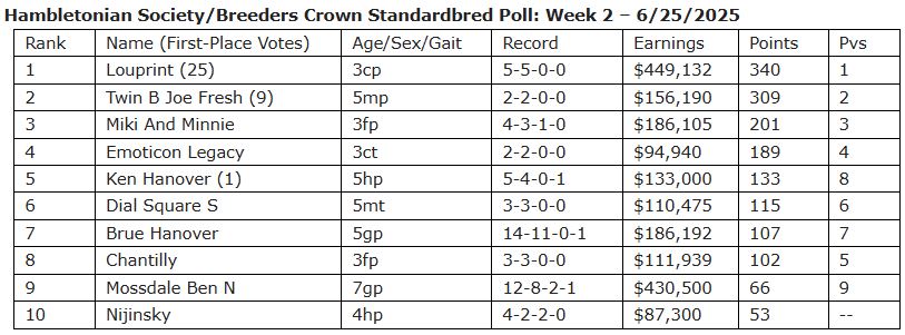 Louprint and Twin B Joe Fresh stayed at No. 1 and No. 2, respectively, after their week off. Louprint received 25 of 35 first-place votes, with Twin B Joe Fresh getting nine and Ken Hanover getting one.