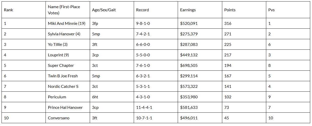 Rankings based on the votes of harness racing media representatives on a 10-9-8-7-6-5-4-3-2-1 basis.