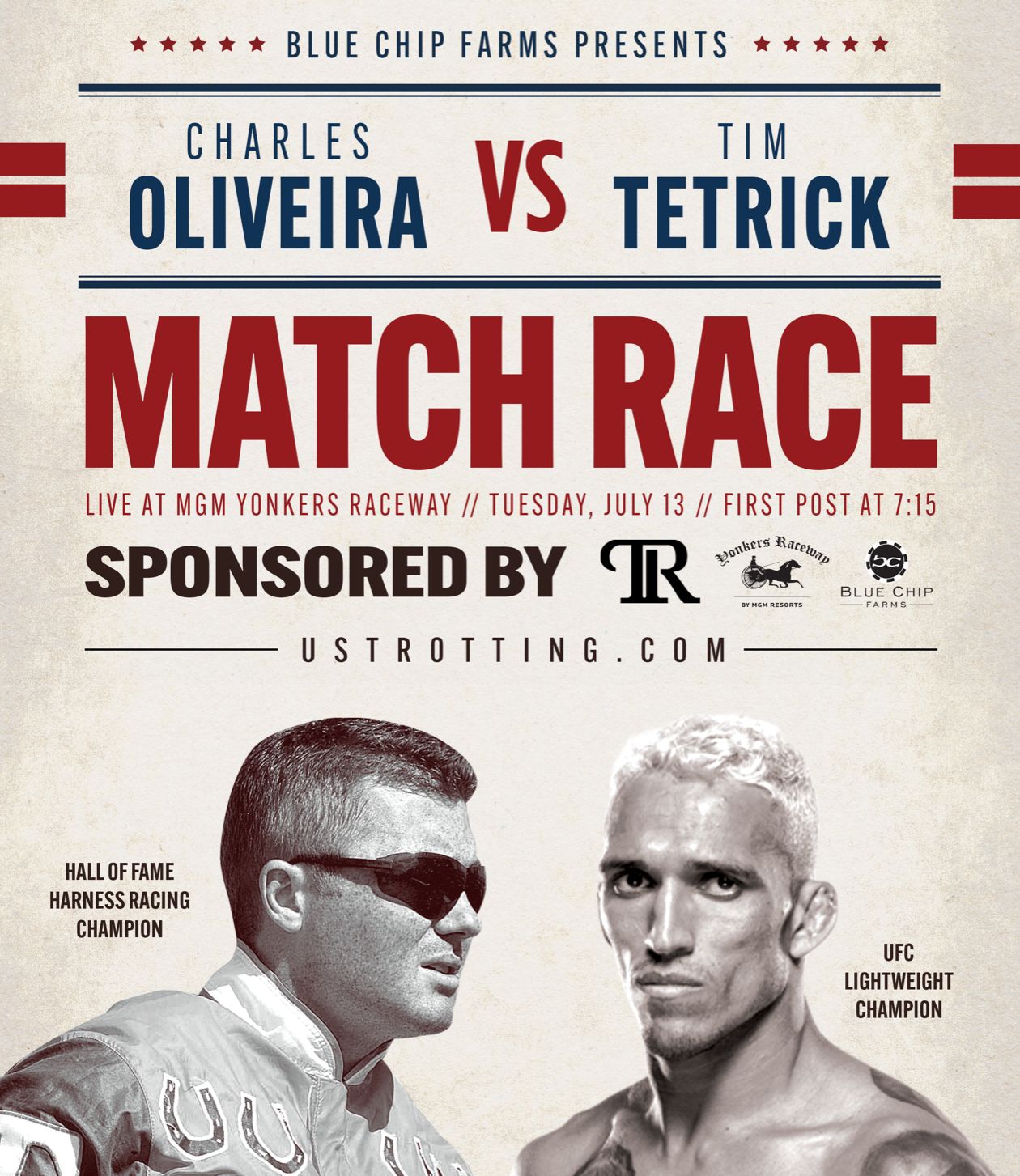 y, newly inducted Hall of Fame driver Tim Tetrick and recently crowned UFC Lightweight Champion Charles Oliveira will face off in a match race, presented by Blue Chip Farms, following the third race on the card.