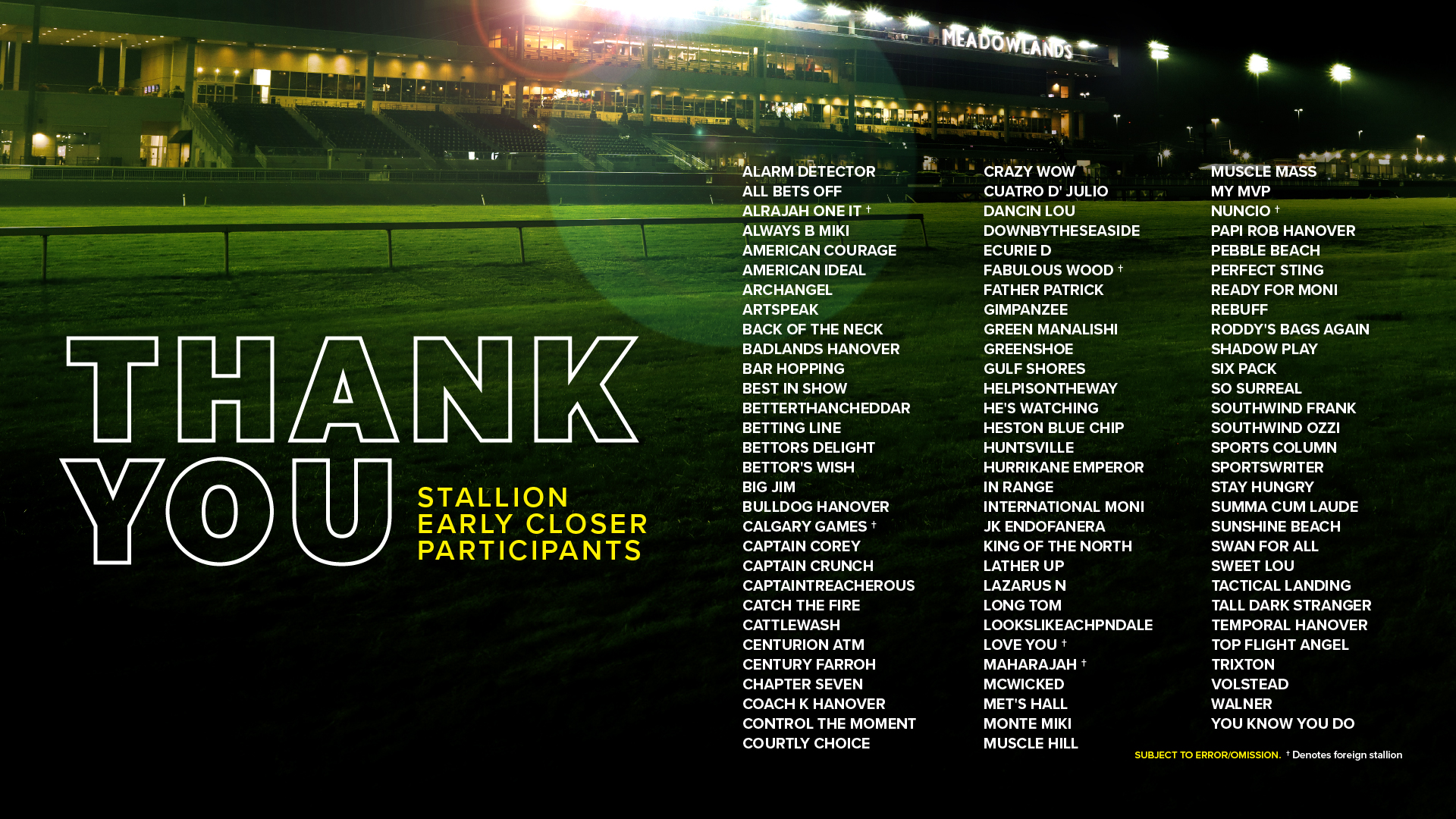 The list of Foreign stallions exempt from the Stallion Early Closer Participation payment with yearlings consigned to the upcoming sales have been added to the list of stallions whose progeny are eligible for nomination to Meadowlands on the web.