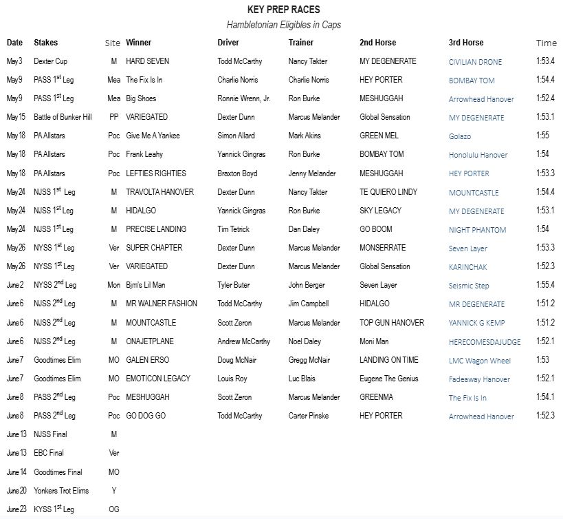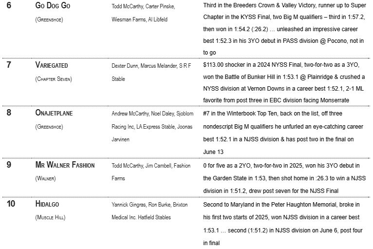 East Rutherford, NJ – Onajetplane and Mr Walner Fashion enter Ken Warkentin’s Road to the Hambletonian presented by FanDuel. After a career best of 1:52.1 at the Meadowlands, Onjetplane is #8 while Mr Walner Fashion debuts at #9 after a sizzling 1:51.2 harness racing win in his NJSS division. Maryland and Super Chapter remain 1-2 and will face off at Vernon Downs in the Empire Breeders Classic on June 13.