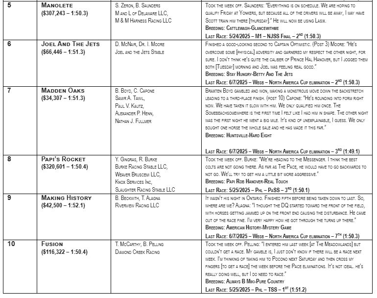 EAST RUTHERFORD, NJ — There are two new names on Dave Little’s Road to the Meadowlands Pace poll as Joel And The Jets and Madden Oaks find themselves as Nos. 6 and 7, respectively, in the seventh edition of the weekly Top 10 off good harness racing performances in the eliminations for the North America Cup, which takes place Saturday night at Woodbine Mohawk Park.