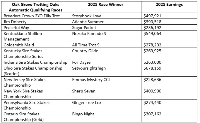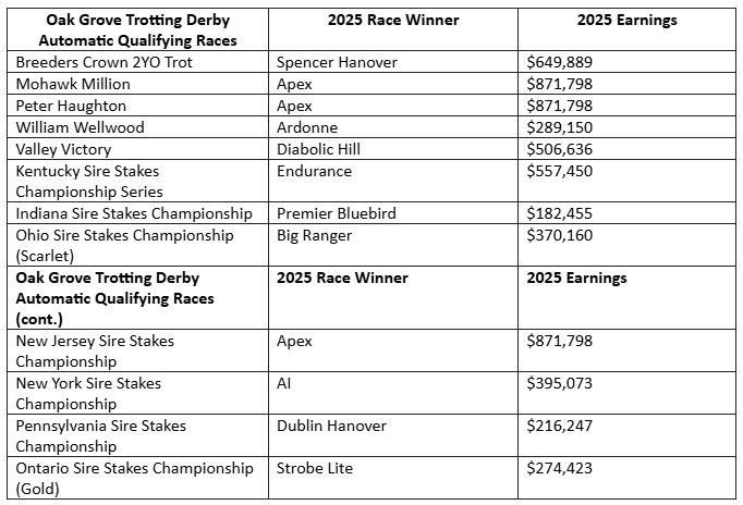 From the 24 “win and you’re in” races, 22 unique winners have now been determined, and each will earn a fully paid, automatic spot in the corresponding elimination race for the 2026 Oak Grove Trotting Derby and Oak Grove Trotting Oaks (with all pre-entry and starting fees covered by the race sponsors). The automatic qualifying races and the 2025 respective race winners are identified below. These impressive two-year-old champions have collective earnings of over $8.5 Million this racing season.