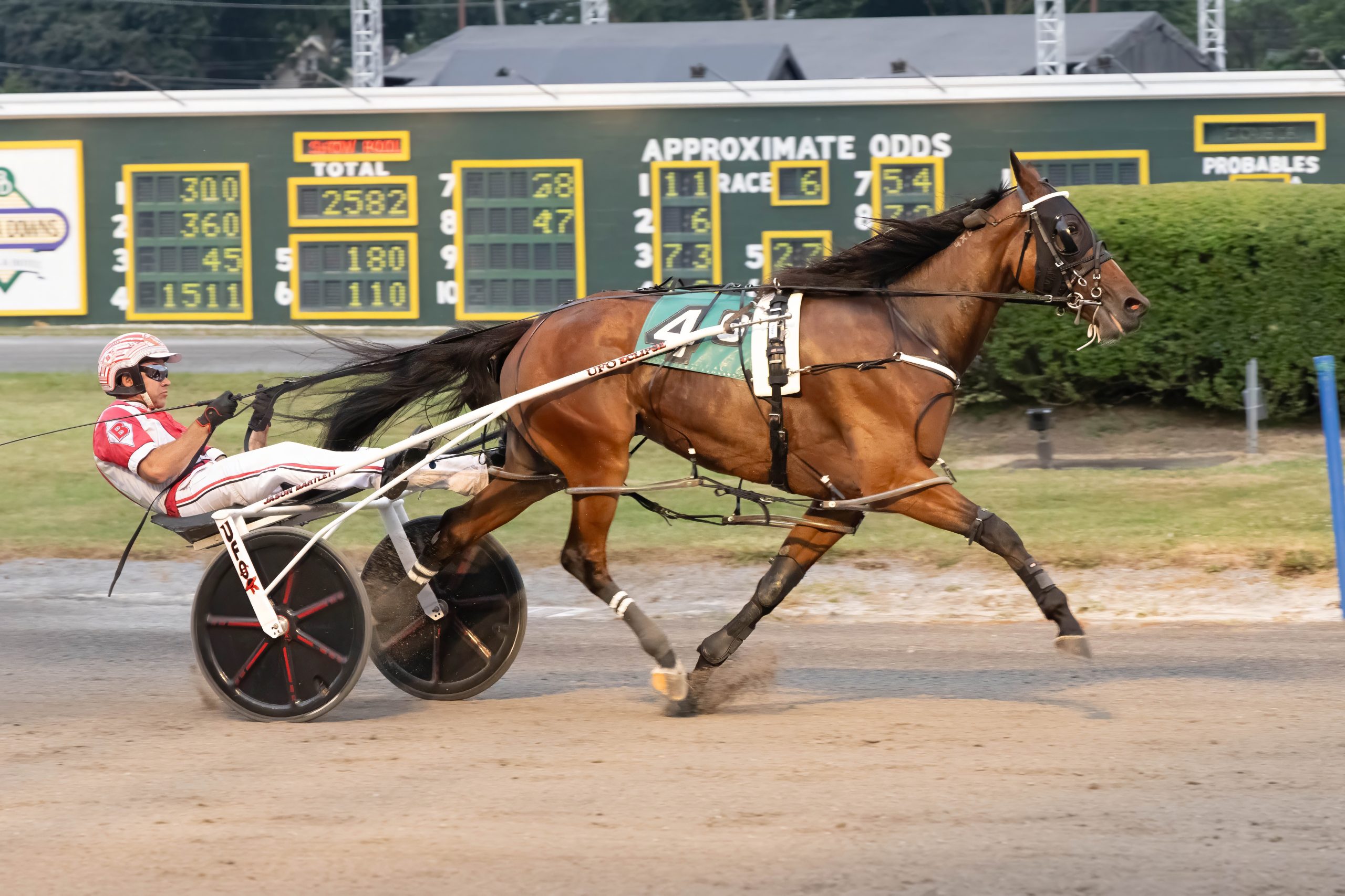 Bartlett slow-rolled The Last Martini to the front and crossed-over in front of Send It Down Slim (Mark Macdonald) as they passed the :27.1 quarter. Once on top, The Last Martini was in total control and was never challenged for the duration. After passing the half in :57 and three-quarters in 1:25.1, The Last Martini took her 1-¾ length lead around the last turn and into the stretch where she paced home a wrapped-up winner in a sharp 1:53.2, which was her fastest win time ever over a half-mile track.