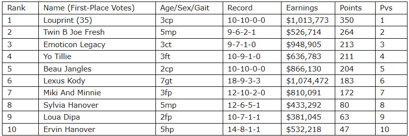 Rankings based on the votes of harness racing media representatives on a 10-9-8-7-6-5-4-3-2-1 basis.