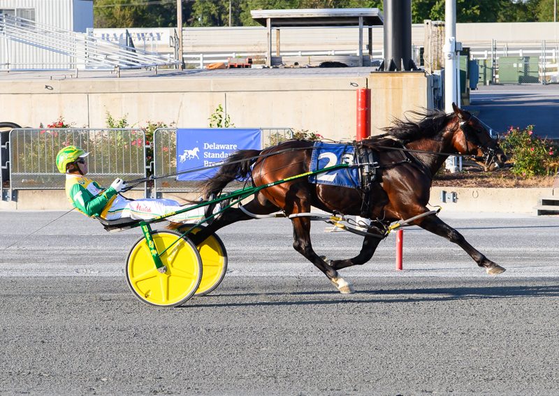 HARRINGTON, DE – A trio of second leg $20,000 Delaware Standardbred Breeders Fund (DSBF) action for 2-year-old pacing colts and geldings highlighted the Monday 15-race Harrington Raceway harness racing program. Burke Racing, Knox Services, Phillip Collura and Weaver Bruscemi’s Watch Em Win ($2.10, Tim Tetrick) was a menacing landslide winner in the fastest division (1:53.1).
